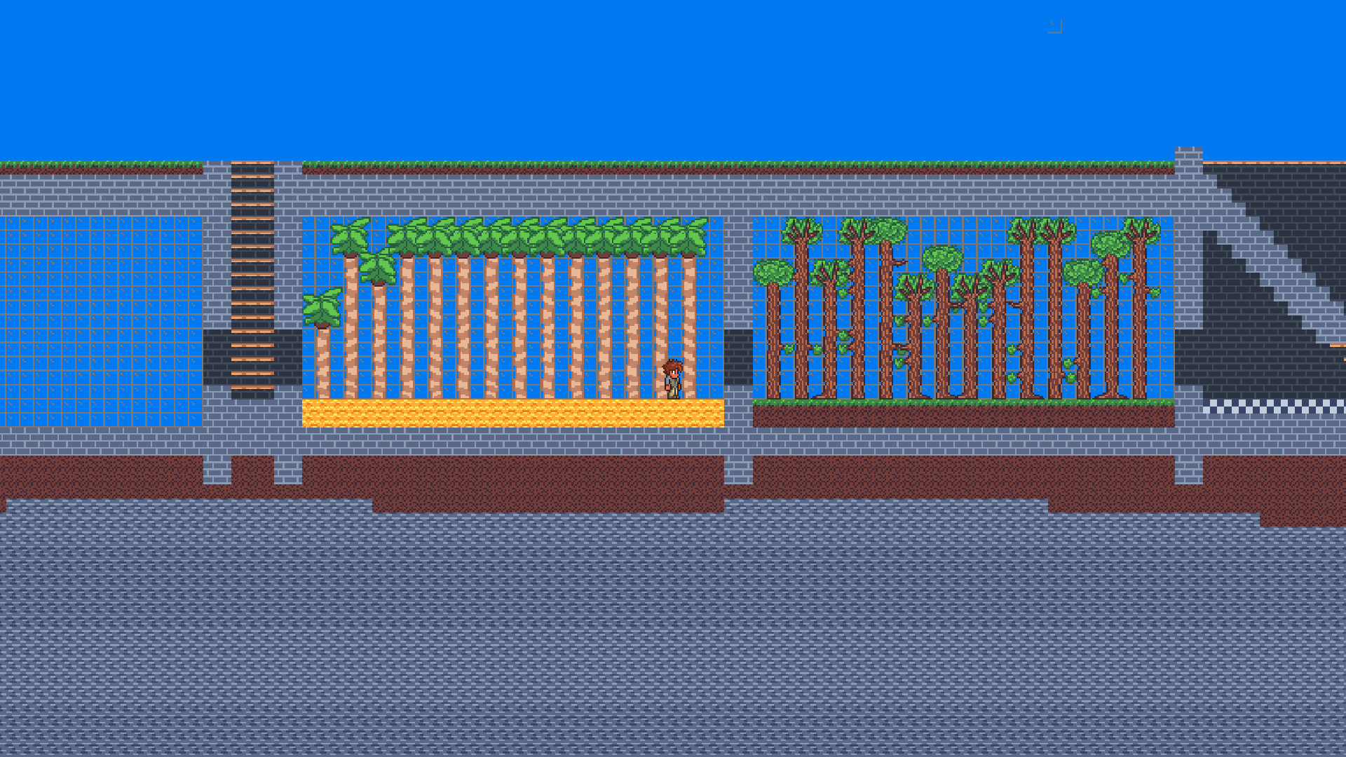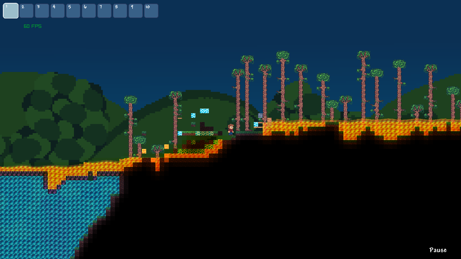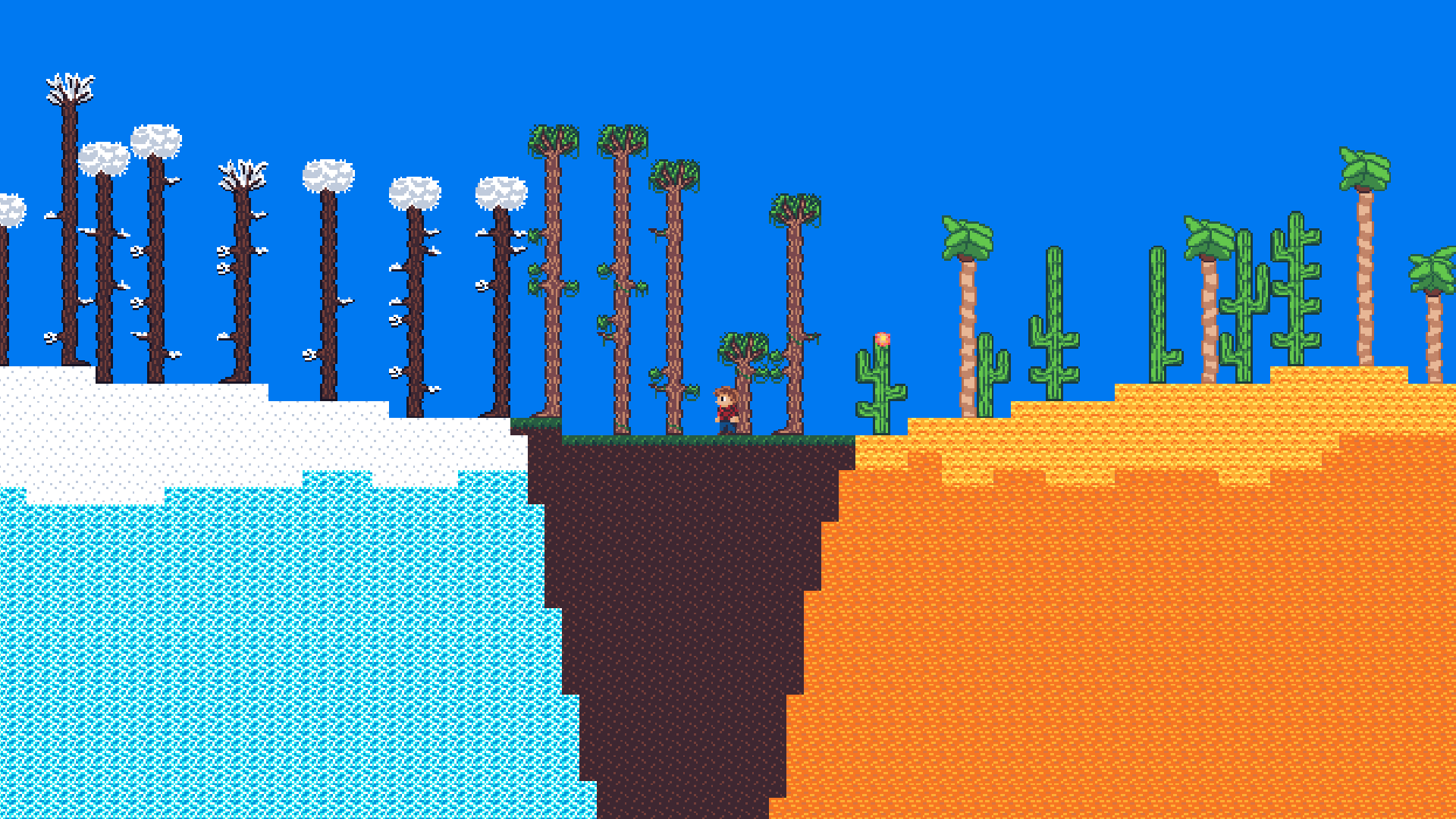 Sandbox-2D has features too many to name. But I'll still list some of the bigger ones. First, world generation featuring a variety of biomes based on temperature and humidity. Each world is different and there's also an option to generate a flat world. Second, player controller - the player can move around, interact with the environment and get hurt by different hazards. The player also has the ability to break and place blocks.
